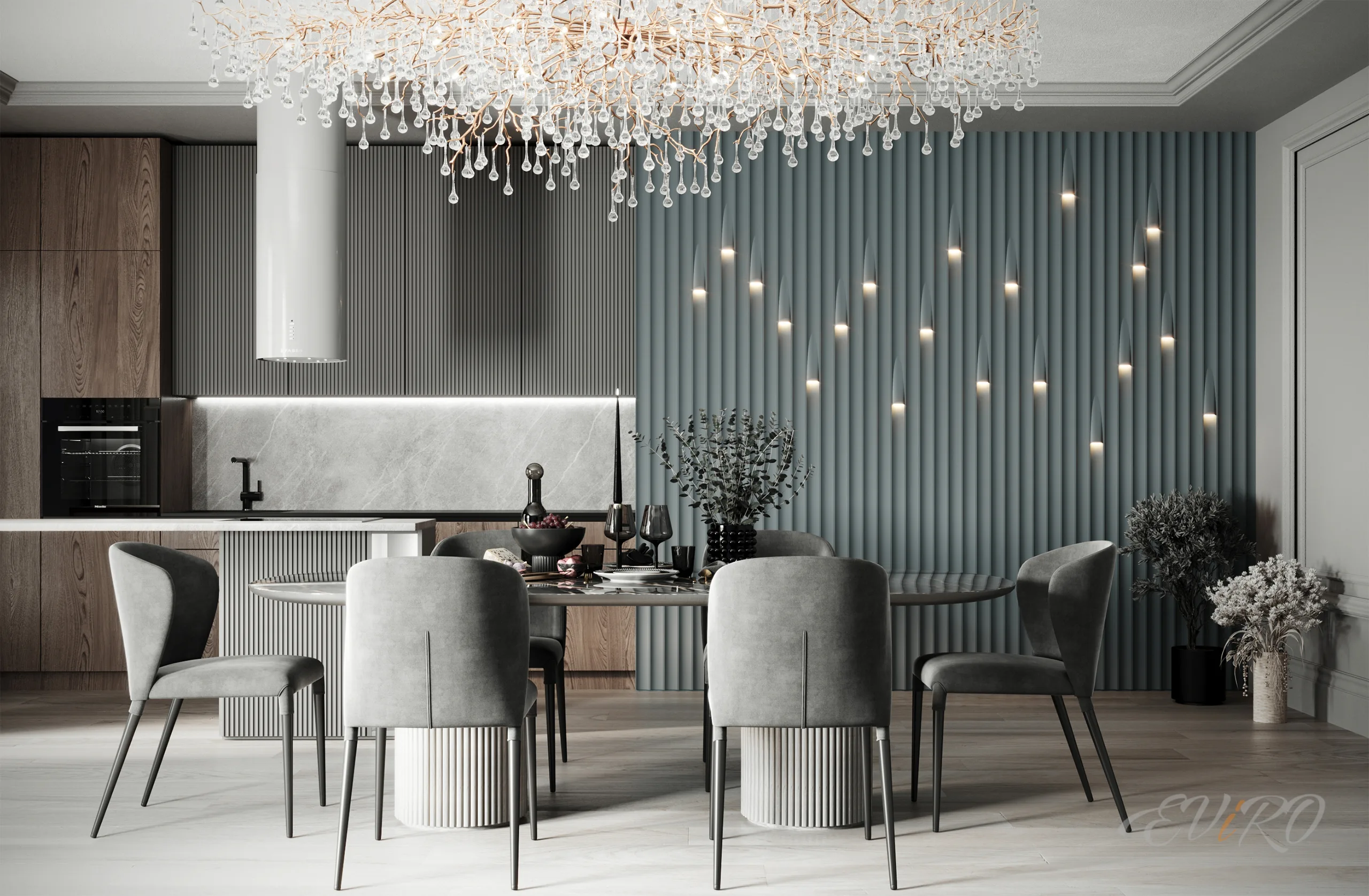 В этом завораживающем танце дизайна сплетаются две неповторимые мелодии реечных 3D панелей: строгий, но элегантный марш Steps и игривая, объемная румба Rollers. Гипсовые рейки Steps, словно колонны света, пронизаны интегрированными световыми элементами, которые можно разместить на любой высоте, направляя лучи вверх, к потолку, или вниз, к полу, создавая неповторимые световые сценарии. Эти световые панели превращают стену в живое полотно, где свет и тень играют в завораживающую игру.